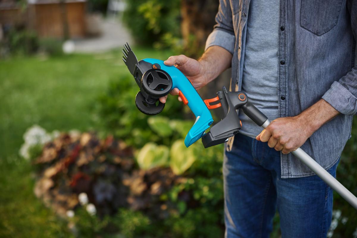 A késcseréhez nincs szükség szerszámokra. Így gyorsan és egyszerűen válthatsz a kertészeti feladatok között.