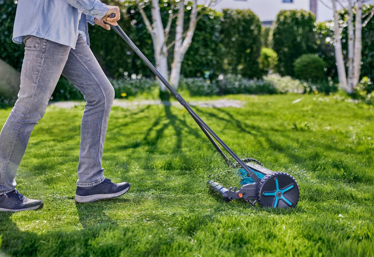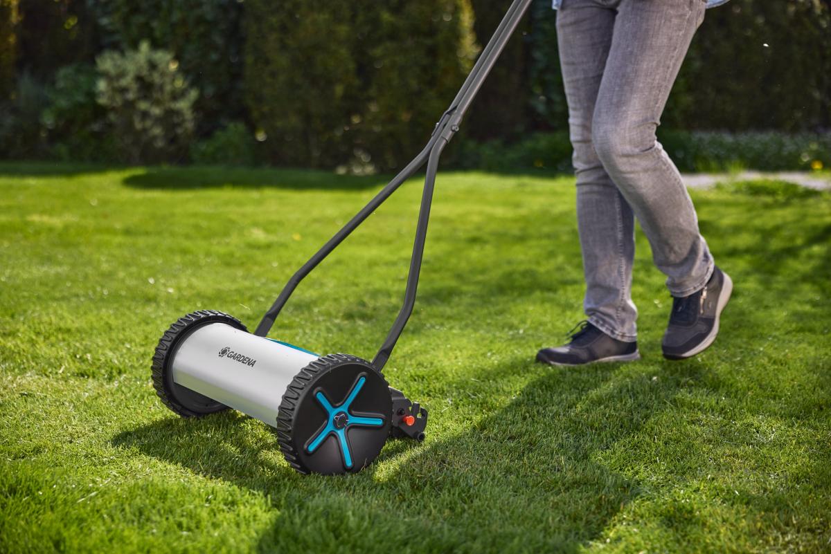 A klasszikus angol gyep megjelenését érheted el ezzel a könnyű, egyszerű és azonnal használatra kész, hengerkéses kézi GARDENA fűnyíróval.