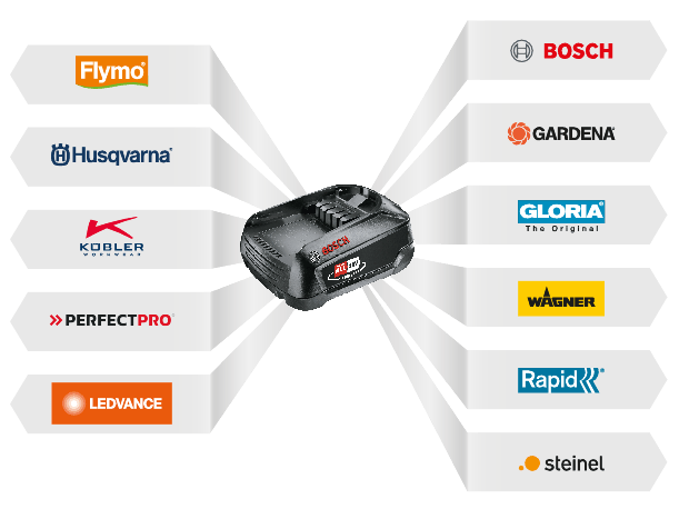 Az Aspire gépek akkumulátorai kompatibilisek az összes Gardena P4A akkumulátoros kerti szerszámmal valamint a Bosch barkács és kerti gépeivel is.
